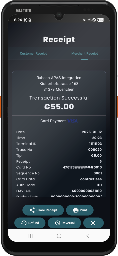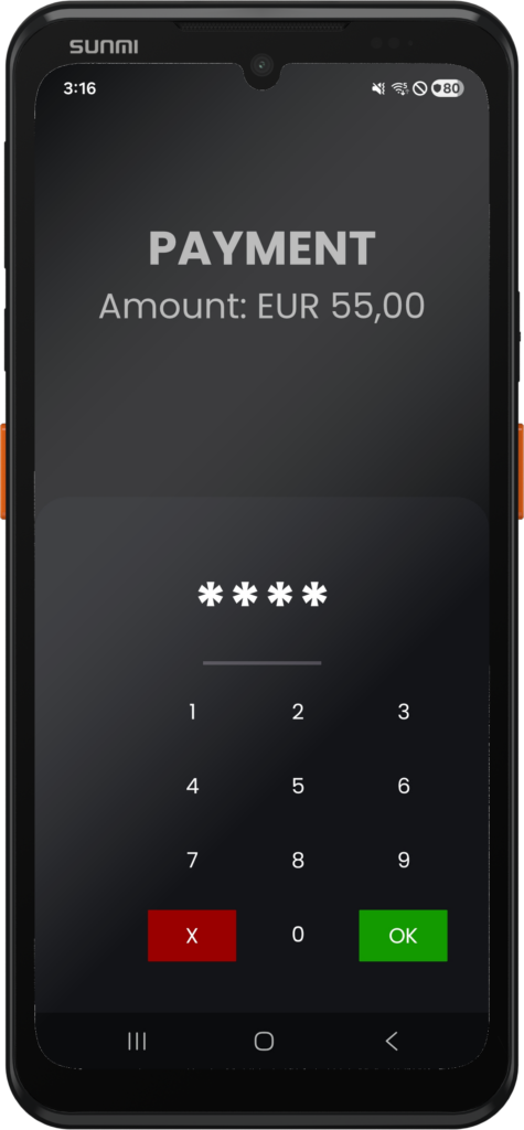 The Rubean Pay APP extends the SoftPOS APP with a) a display for entering the payment amount and b) options for issuing a customer receipt (QR code, e-mail, SMS) and thus serves as a checkout app, especially for retailers who are looking for a simple solution for accepting contactless card payments on their smartphone.